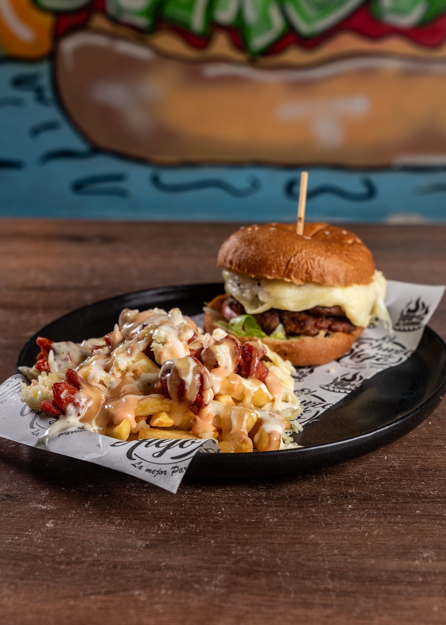 125 gr de carne de res, maicito desgranado, pepinillos, aguacate, ripio de papa, tomate, cebolla, lechuga, variedad de salsas y queso mozarella.